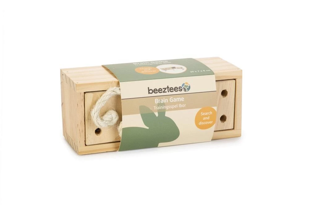 Het houten blokje kan omhoog worden gehaald door middel van het touwtje, waarna je er de favoriete traktatie van jouw knaagdier in kunt stoppen. Jouw knaagdier zal de traktatie eruit proberen te halen door aan het touwtje te trekken.