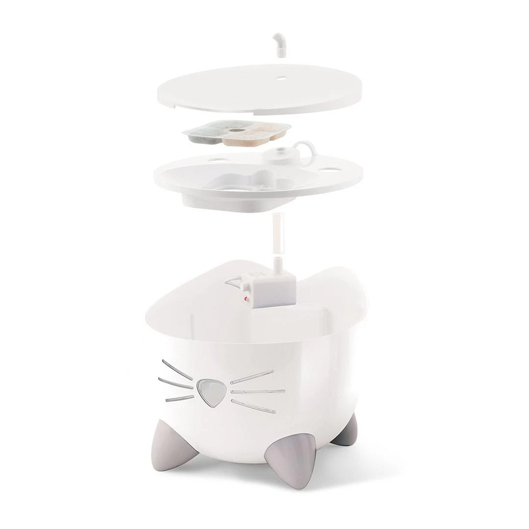 De drinkfontein heeft een capaciteit van 2,5 liter en is voorzien van een energiezuinige, stille pomp met een sensor. De pomp schakelt de fontein automatisch uit als de waterstand te laag is.