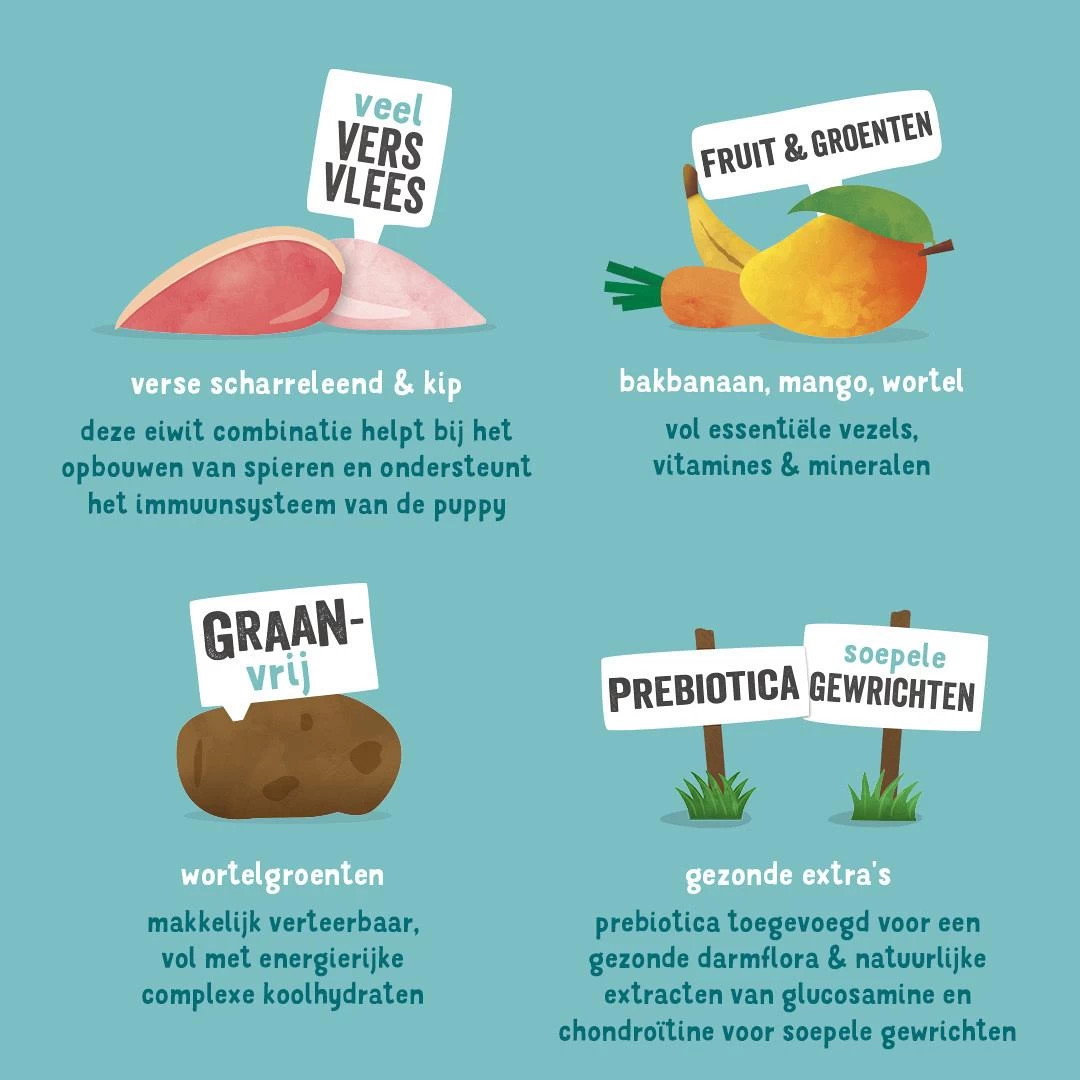 • Verse scharreleend zit vol met proteïnen om de spieren van puppys te versterken
