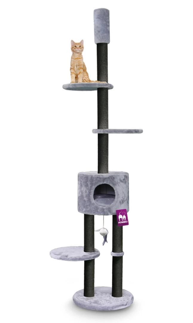 Door de plafondspannen kan de Anna 240 eenvoudig vastgezet worden aan het plafond. Met zijn slaapruimte, ligplateau’s en zeven stammen van 9 cm dik zal jouw kat al zijn energie kwijt kunnen in dit model.