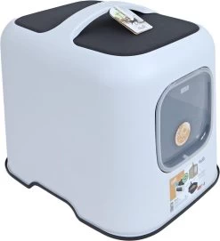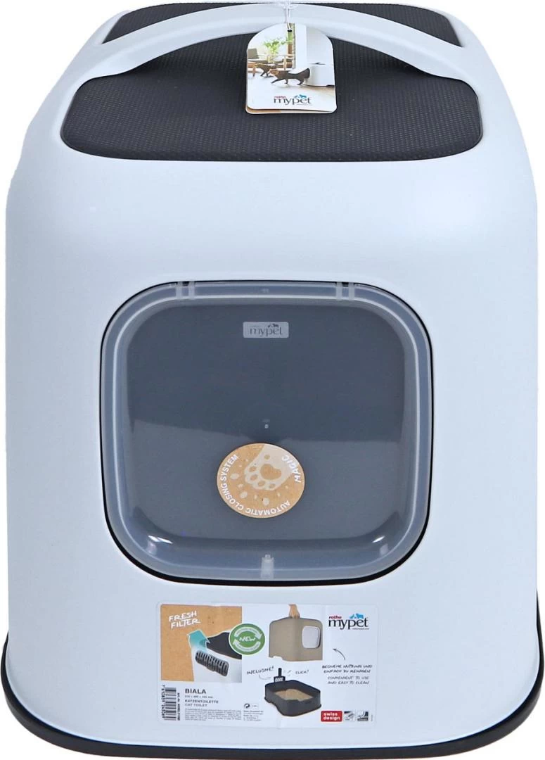 De flap en de onderbak zijn voorzien van een kleine magneet, waardoor de flap altijd netjes terugvalt op zijn plaats. Dit zorgt ervoor dat er ook geen onaangename geurtjes kunnen ontsnappen uit het toilet. De kattenbak is voorzien van een geurfilter en een kattenbakschep, die je kan opbergen aan de binnenkant van de bak.