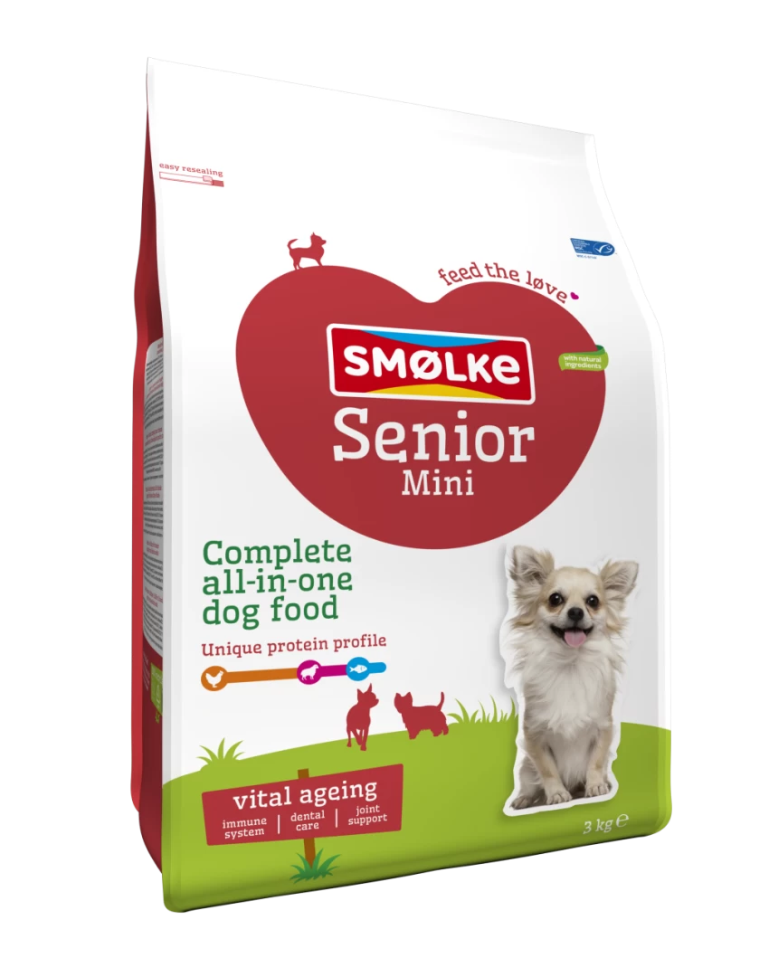 De voeding is samengesteld zonder tarwegluten en bevat speciale mineralen om tandplak te helpen voorkomen. Smølke Senior Mini is gemaakt met natuurlijke ingrediënten en heeft een uniek eiwitprofiel bereid met Nederlandse kip, MSC vis en Brits lam.