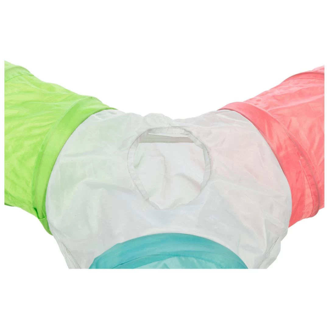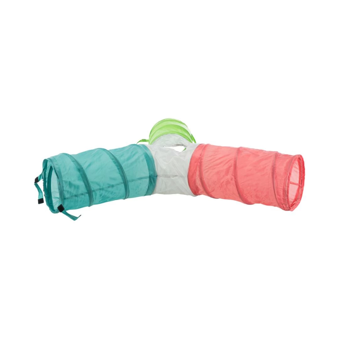 Trixie speeltunnel Dwergkonijn 4 uitgangen is een vormvaste, nylon speeltunnel met drie gangen en vier openingen. Konijnen en cavia’s verstoppen zich graag, en dat gaat prima in deze leuke tunnel. Uit te breiden met meerdere tunnels.
