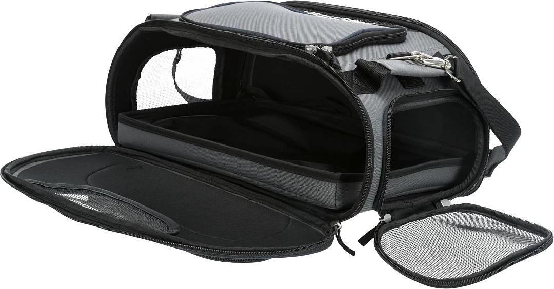 De tas is gemaakt van vormvast EVA met polyester voor een veilige, comfortabele vlucht. De tas is te bevestigen aan een trolley en komt tevens met een afneembare schouderriem en twee handgrepen. Je kunt de tas openen aan de zij-, boven- en voorkant zodat je ook in kleine ruimten altijd voldoende toegang hebt tot jouw dier. In het buitenvak kun je losse spulletjes meenemen. Met geïntegreerde korthouder die voorkomt dat jouw dier onverwacht uit de tas kan springen. De gevoerde en watervaste bodemplaat is uitneembaar.